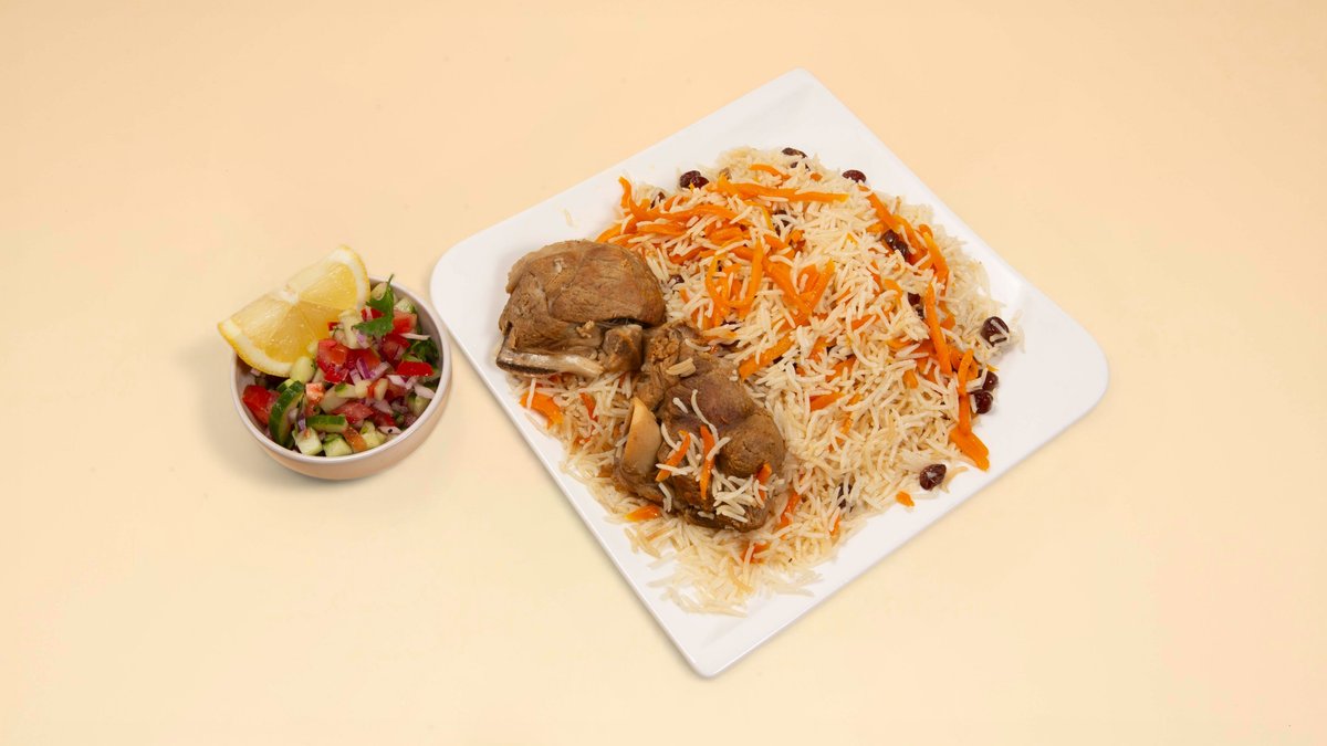 Reis mit Lamm- und Rindfleisch, Zwiebeln, Knoblauch, Kreuzkümmel, Kardamom, Zimt, Nelken, schwarzem Pfeffer, Salz, karamellisierten Karottenstreifen, Rosinen und einem Dressing deiner Wahl