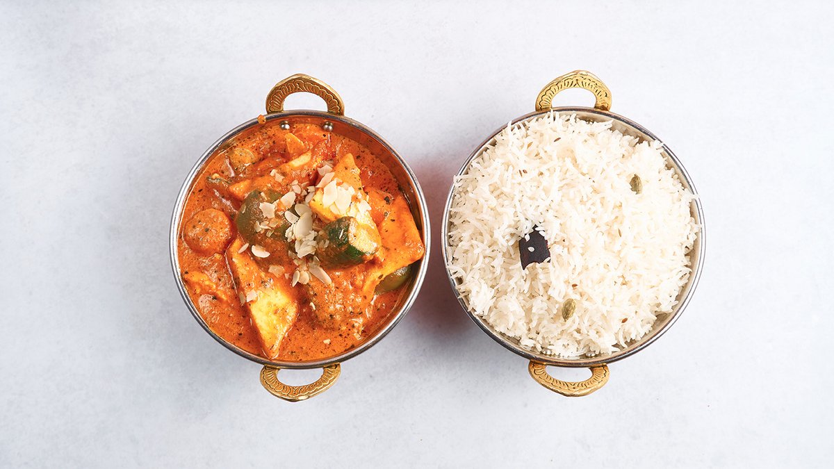 auf Wunsch vegan Kichererbsen in einer pikanten Currysoße mit Beilage deiner Wahl