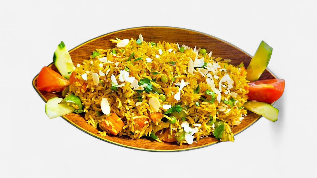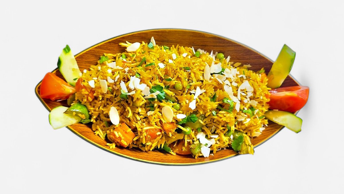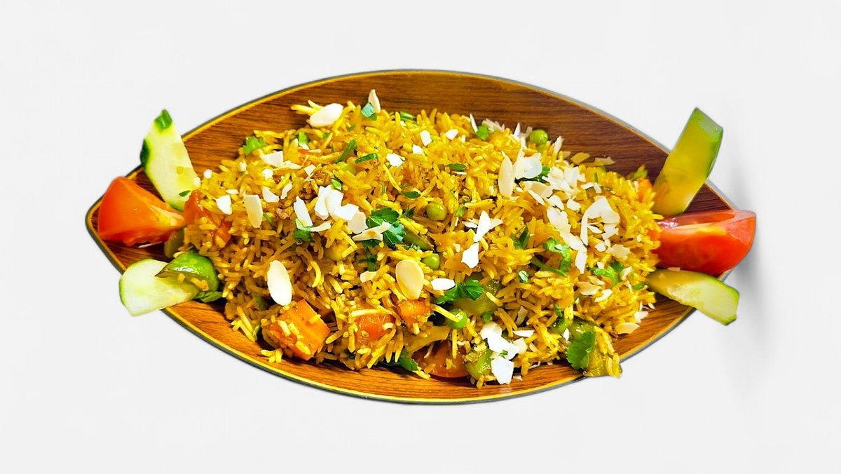 Hühnerfilet gebraten mit Basmatireis, Paprika, Zwiebeln, Rosinen, Nüssen, Knoblauch, frischem Ingwer und serviert mit einer gewürzten Joghurtsoße.