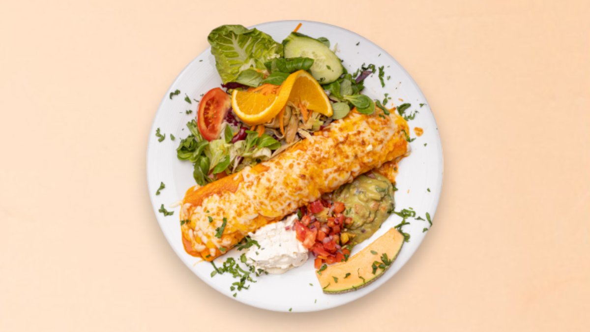 alle Burritos werden mit Weizenmehl-Tortilla, Bohnenpüree, Reis, Tomatensoße und Käse zubereitet