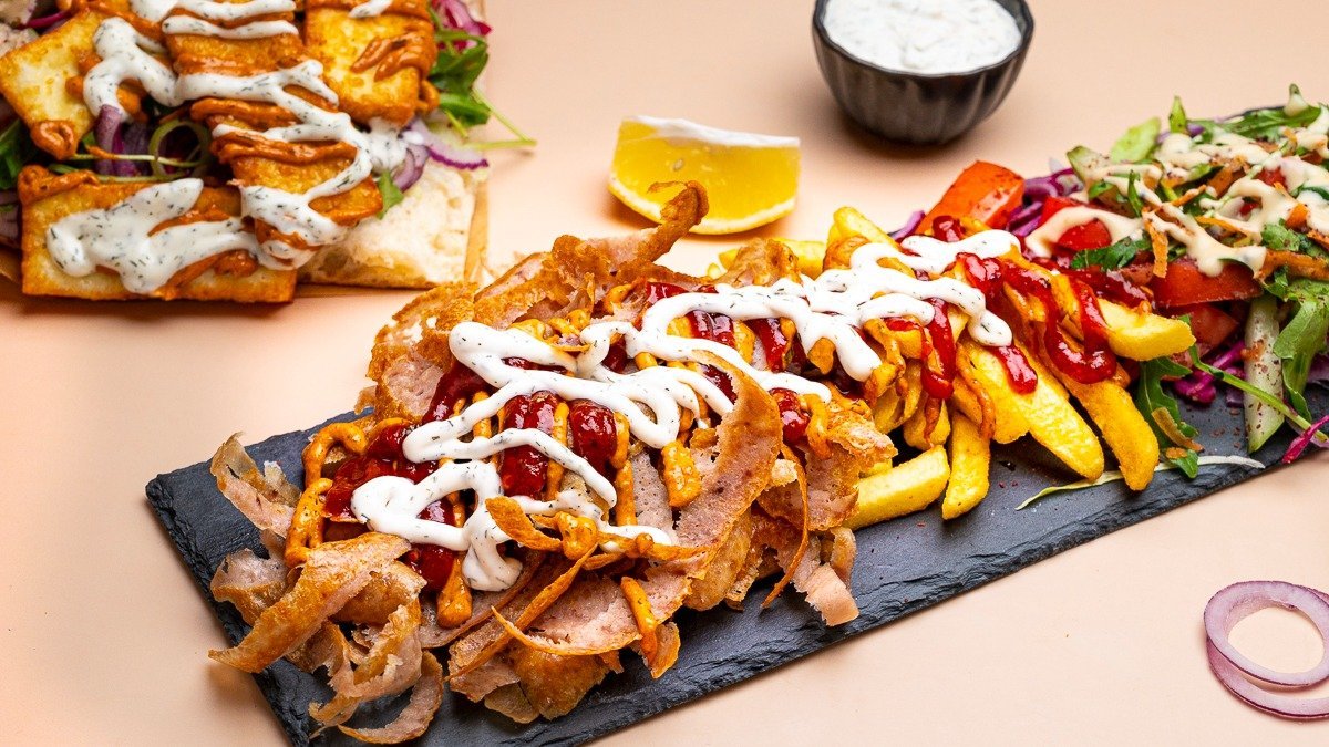 alle Gerichte werden mit Kalbsdrehspieß, Eisbergsalat, Tomaten, Gurken, Rotkohl, roten Zwiebeln und einer Soße deiner Wahl zubereitet