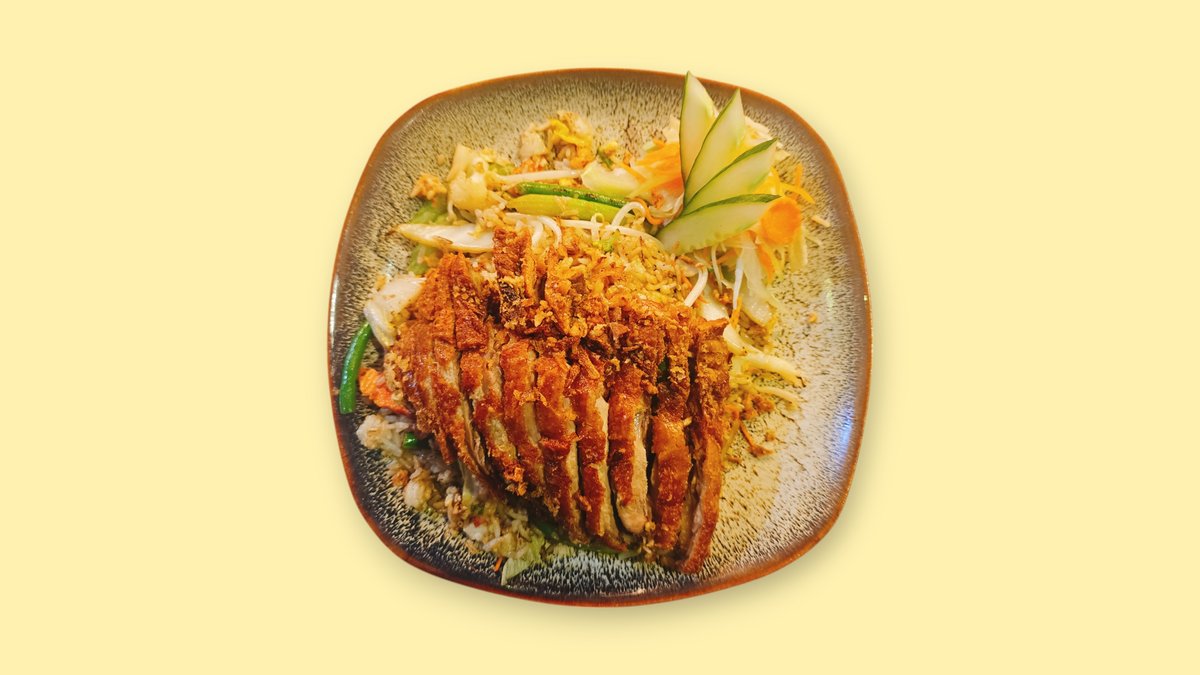 gebratener Reis mit verschiedenen Gemüsesorten und gerösteten Zwiebeln