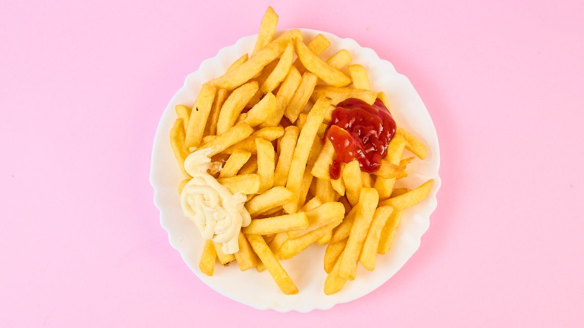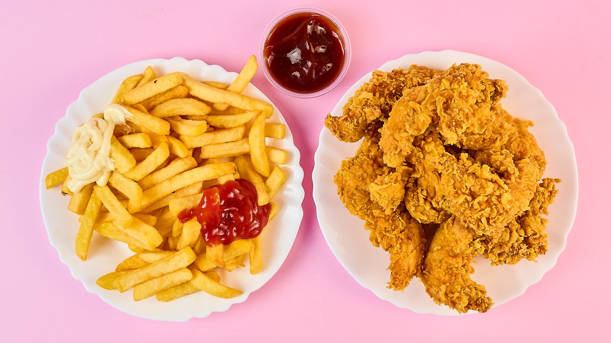 Menü mit 5 knusprig frittierten Hähnchenfilets, dazu Pommes und 1 Dip nach Wahl