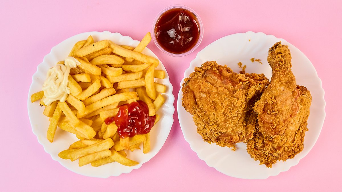 Menü mit 3 knusprigen Hähnchenkeulen, serviert mit Pommes und 1 Dip nach Wahl