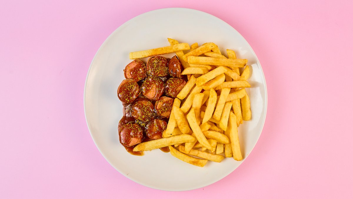 herzhaft gewĂĽrzte Currywurst, serviert mit knusprigen Pommes frites