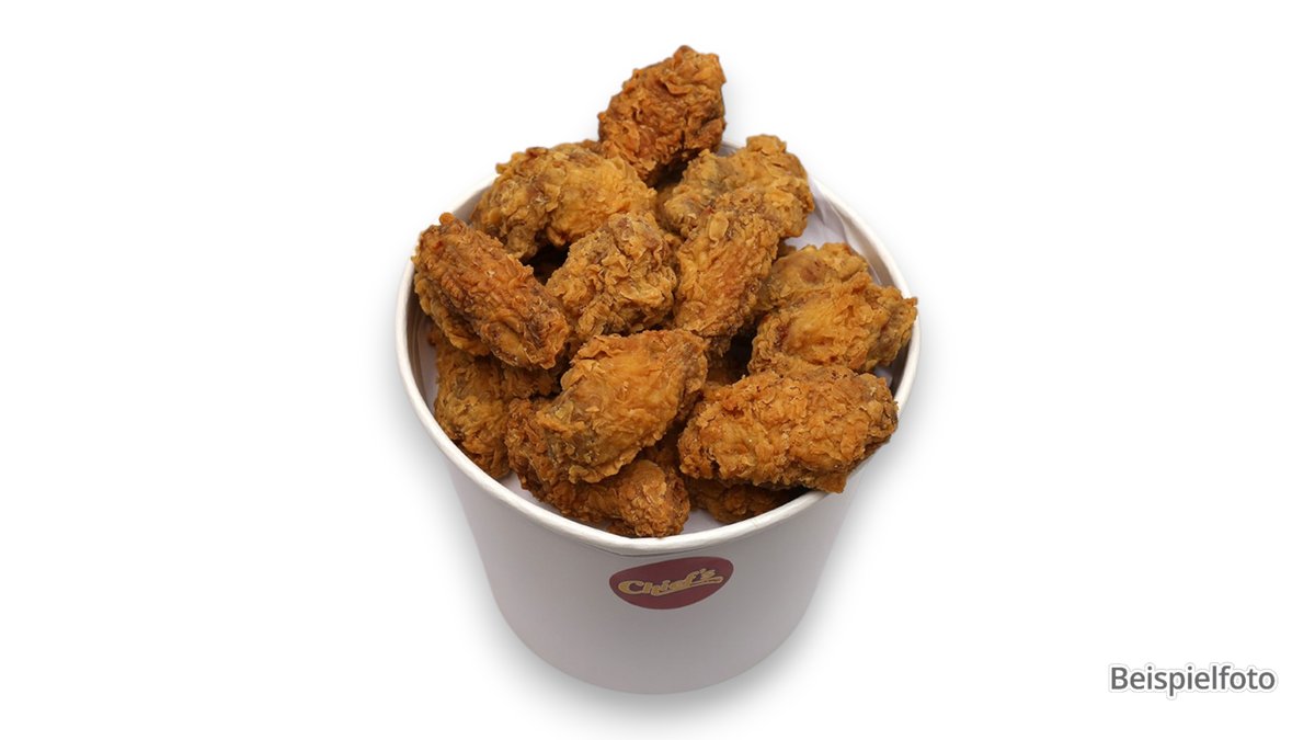 Eimer mit 12 knusprig frittierten Chicken Wings, wahlweise scharf oder klassisch und Dip nach Wahl