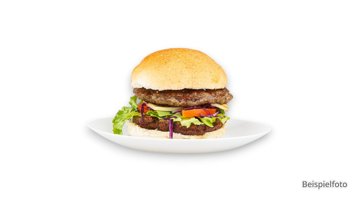 doppelter Burger mit 2x Beef Patty, Salat, Tomaten, Zwiebeln, Gurken und hausgemachter SoĂźe