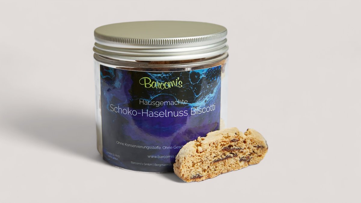 Unsere knusprigen Schoko-Haselnuss Biscotti mit Stücken feinster belgischer Zartbitterschokolade und gerösteten Haselnüssen sind ein Genuss. Von Hand und mit viel Liebe gefertigt, basieren sie auf einem Rezept aus Cynthia Barcomi's "I Love Baking" Backbuch. Die Biscotti kommen in einem wiederverwendbaren, klaren Behälter mit einem stilvollen Barcomi's Label. Der Behälter ist 10 cm hoch und hat einen Durchmesser von 10 cm und lässt sich mit einem schönen Aluminiumdeckel verschließen. Ca. 150 g Zutaten: Mehl, Zucker, Zartbitterschokolade, Haselnüsse, Butter, Ei, Vanillearoma (kein Vanillin), Natron, Backpulver, Salz.