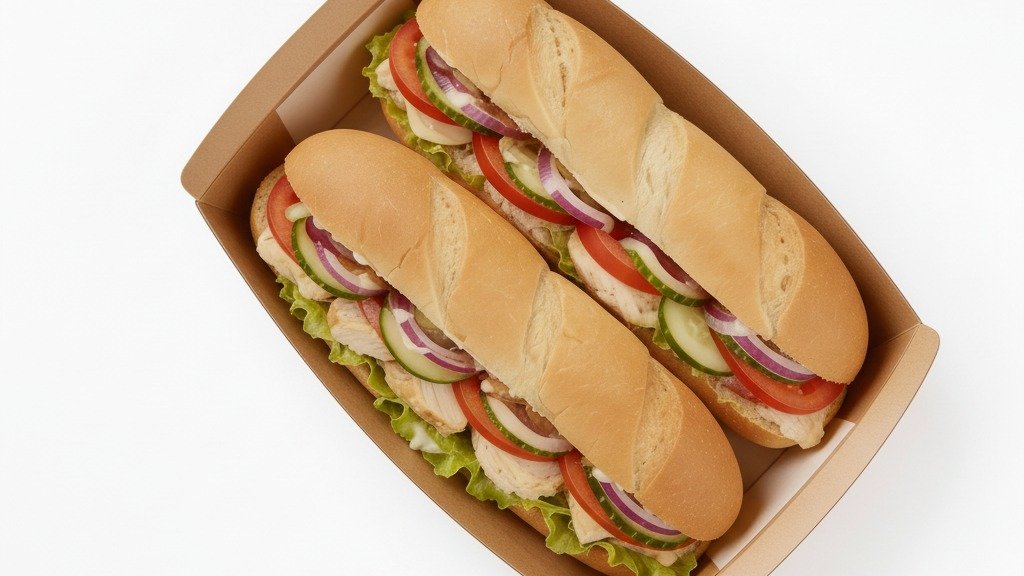 4 Sandwiches nach Wahl. Mit Cheese, Eisberg, Gurken, Tomaten, Zwiebeln und Sauce.