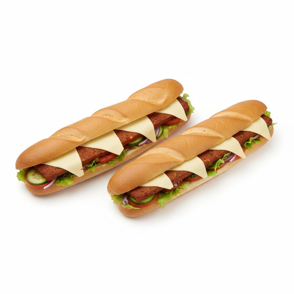 2 Vegan Fleisch Sandwiches mit Cheese, Eisberg, Gurken, Tomaten, Zwiebeln und Sauce.