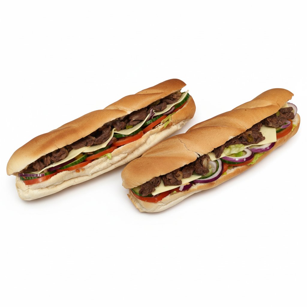 2 Steak Sandwiches mit Cheese, Eisberg, Gurken, Tomaten, Zwiebeln und Sauce.
