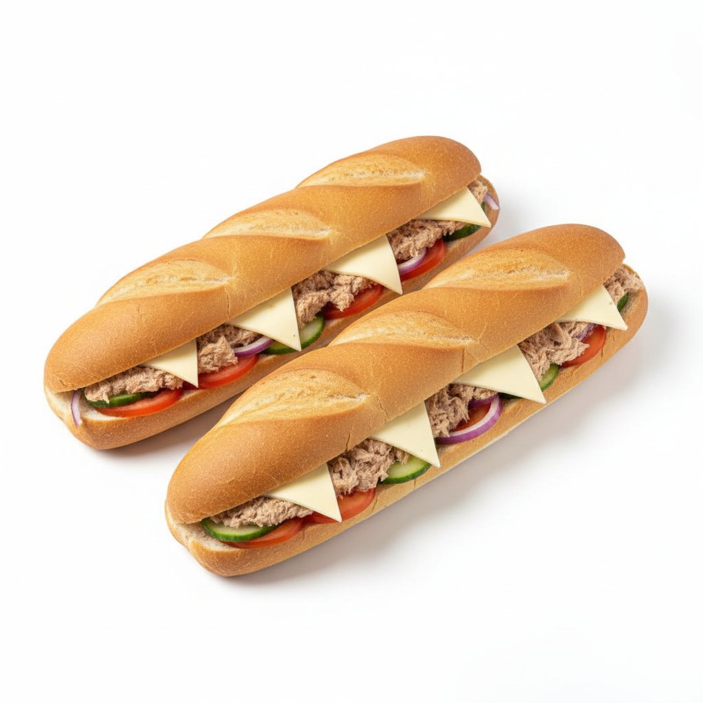 2 Tuna Sandwiches mit Cheese, Eisberg, Gurken, Tomaten, Zwiebeln und Sauce.