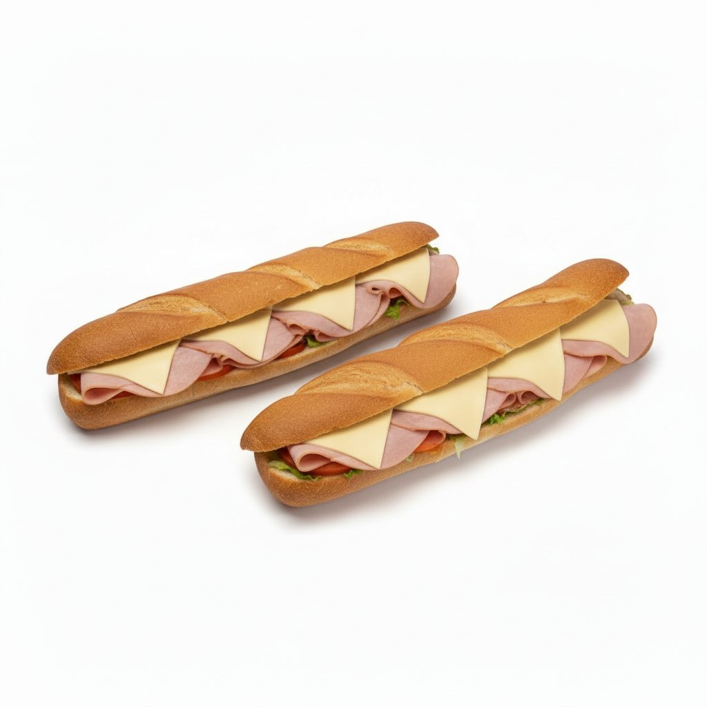 2 Schinken Sandwiches mit Cheese, Eisberg, Gurken, Tomaten, Zwiebeln und Sauce.