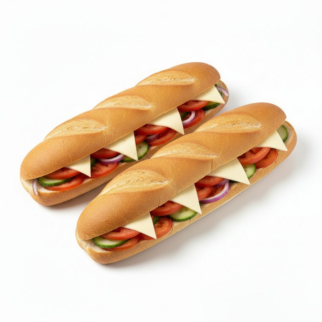 2 Veggie Sandwiches mit Cheese, Eisberg, Gurken, Tomaten, Zwiebeln und Sauce.
