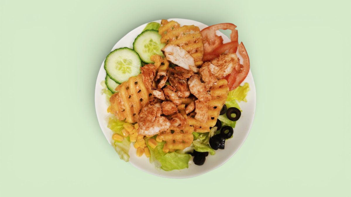 Chicken, Fries, Eisberg, Tomaten, Gurken, Oliven, Mais und Sauce.
