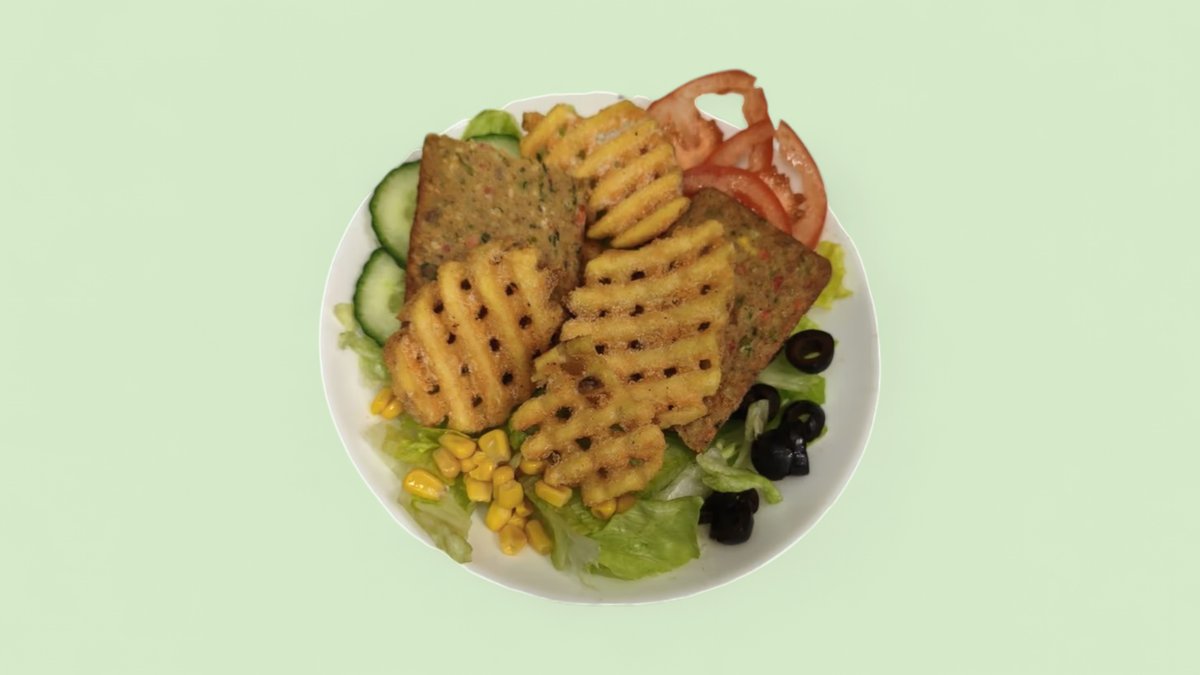 Vegan Fleisch, Fries, Eisberg, Tomaten, Gurken, Oliven, Mais und Sauce.