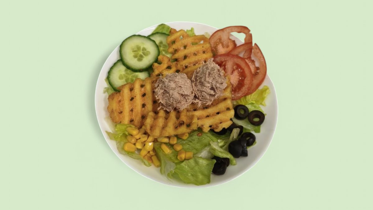 Tuna, Fries, Eisberg, Tomaten, Gurken, Oliven, Mais und Sauce.
