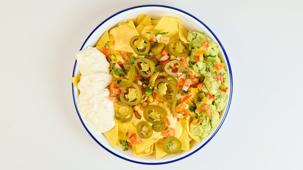 Tortilla Chips mit unserer hausgemachten Käsesoße, Guacamole, Pico de Gallo, sauerer Sahne und Jalapeños