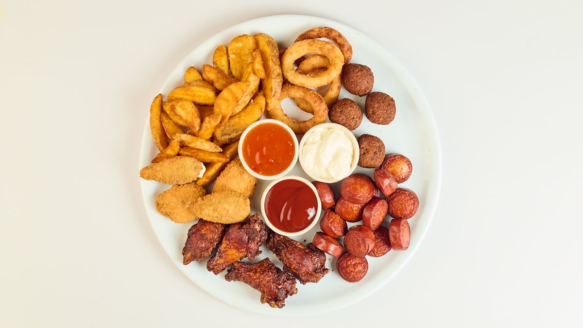 mit Wings aus Schweinefleisch, Falafel, Onion Rings, Bockwurst, Wedges und Jalapeño Poppers serviert mit BBQ, Ranch und süßer Chilisoße