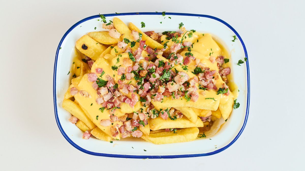 Pommes frites mit hausgemachter Käsesoße, Speckstücke vom Schwein und Petersilie