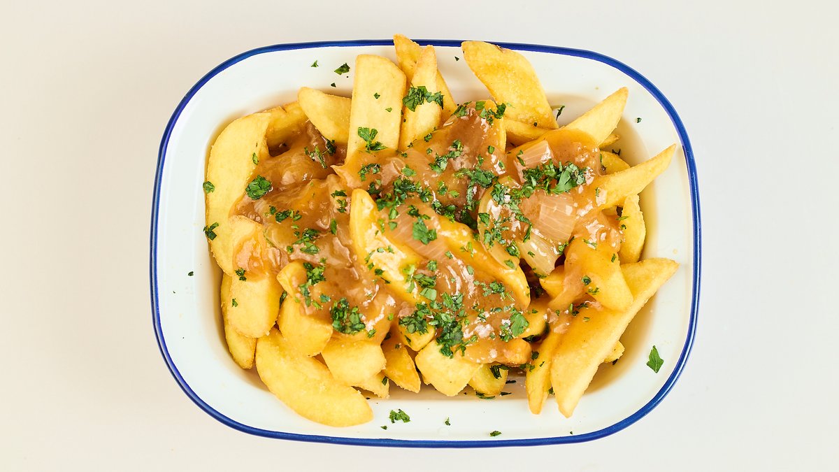 Pommes frites mit Zwiebelsoße und Petersilie