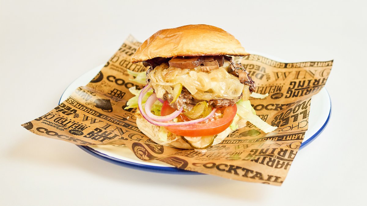 mit gegrilltem Rindfleisch, geschmolzener Cheddar Käse, knuspriger Speck, karamellisierten Zwiebeln, Pilzen und Barbecuesoße