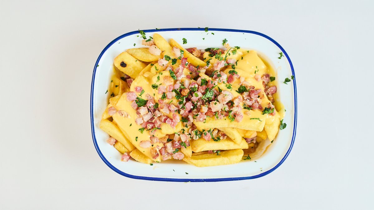 Pommes frites mit hausgemachter Käsesoße, Speckstücke vom Schwein und Petersilie