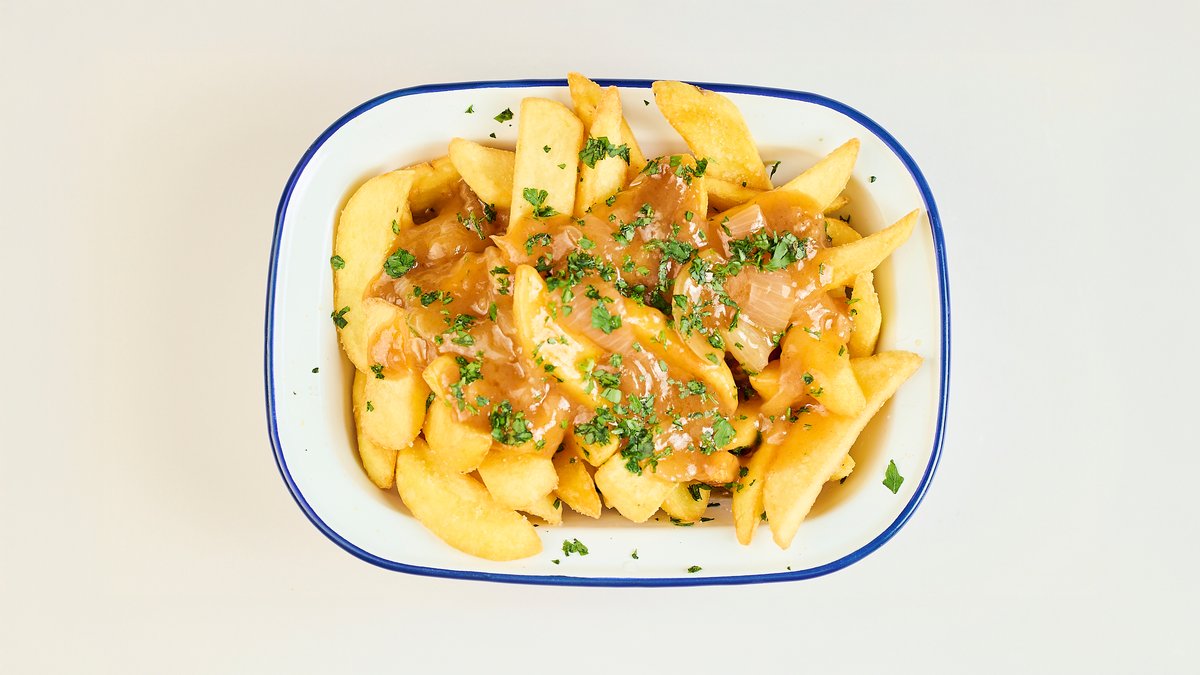 Pommes frites mit ZwiebelsoĂźe und Petersilie