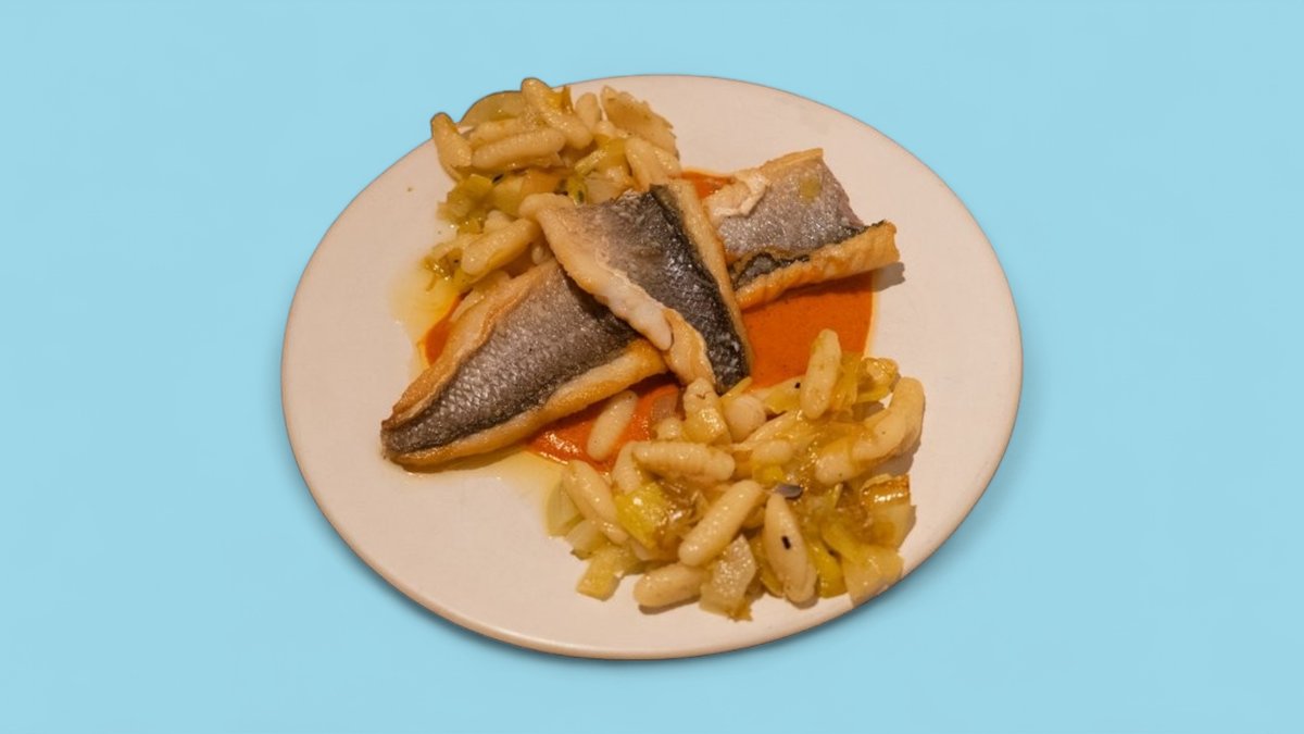 mit Romesco, Lauch, hausgemachten Gnocchetti Sardi und fermentierten grünen Tomaten