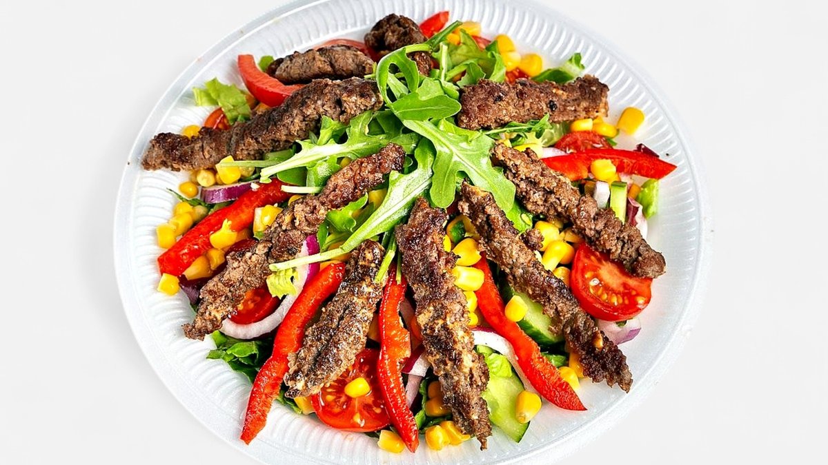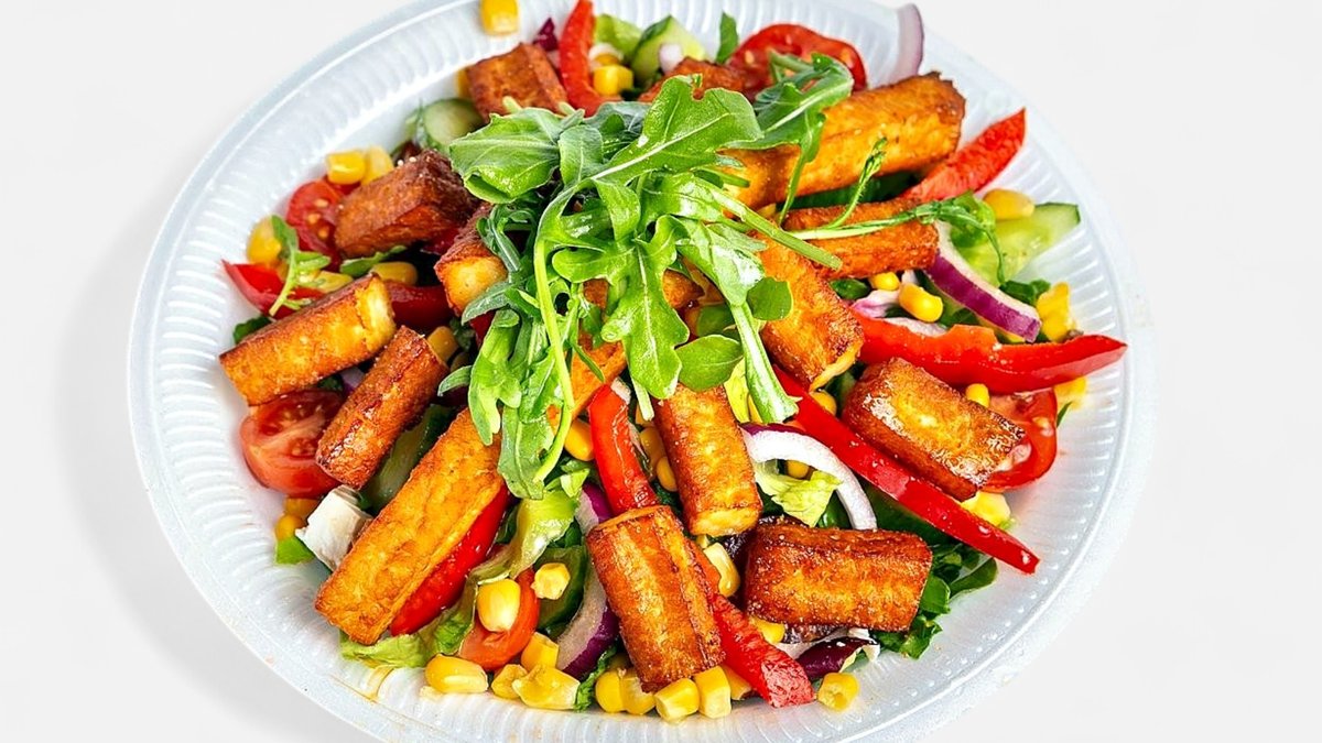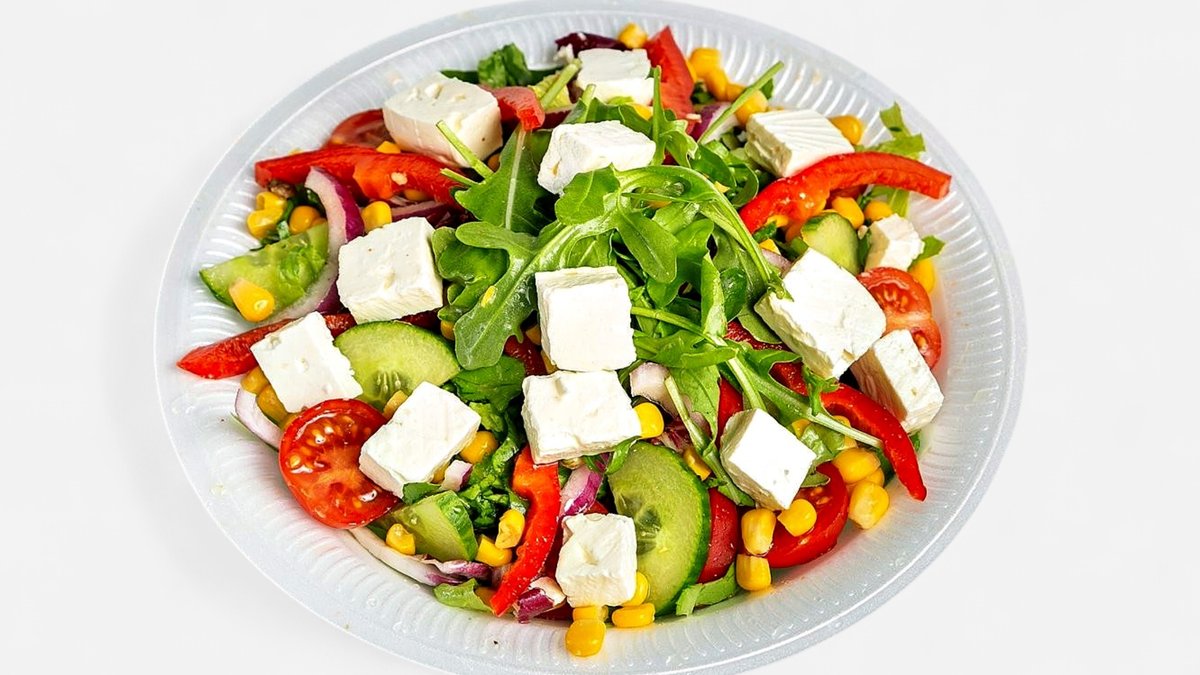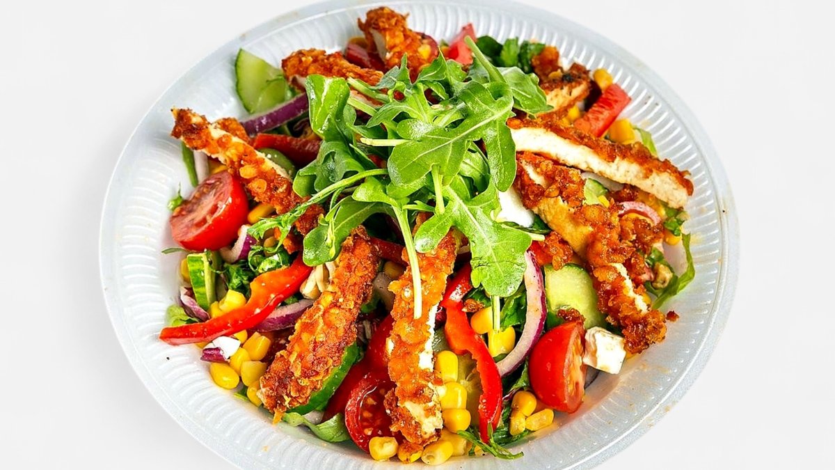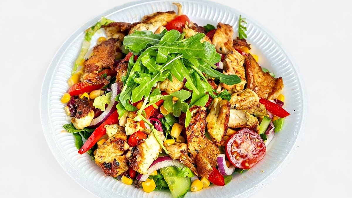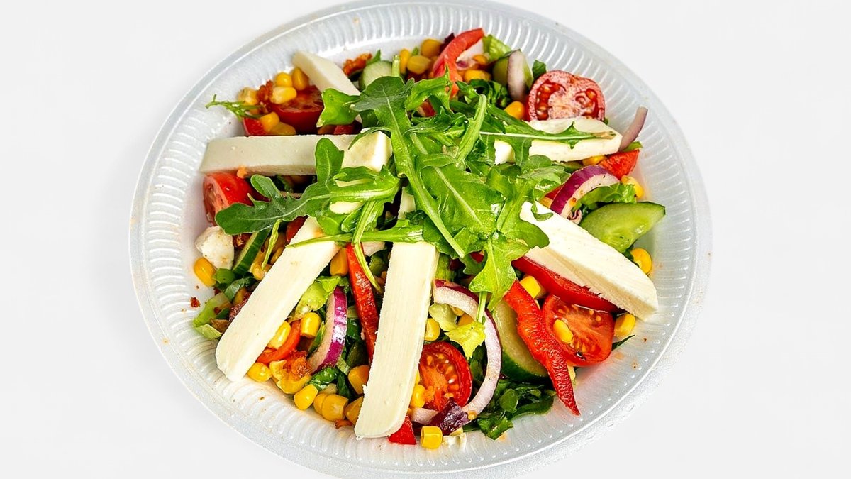 alle Salate werden mit Kirschtomaten, Paprika, Gurken, Zwiebeln, Mais, Rucola und einem Dressing deiner Wahl zubereitet