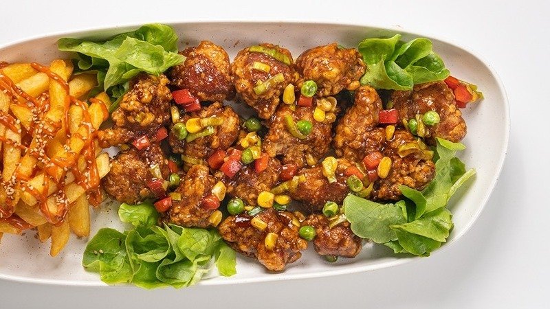 alle Gerichte werden in einer Größe deiner Wahl serviert („Pop Chicken“ wird in keiner Größe deiner Wahl serviert)