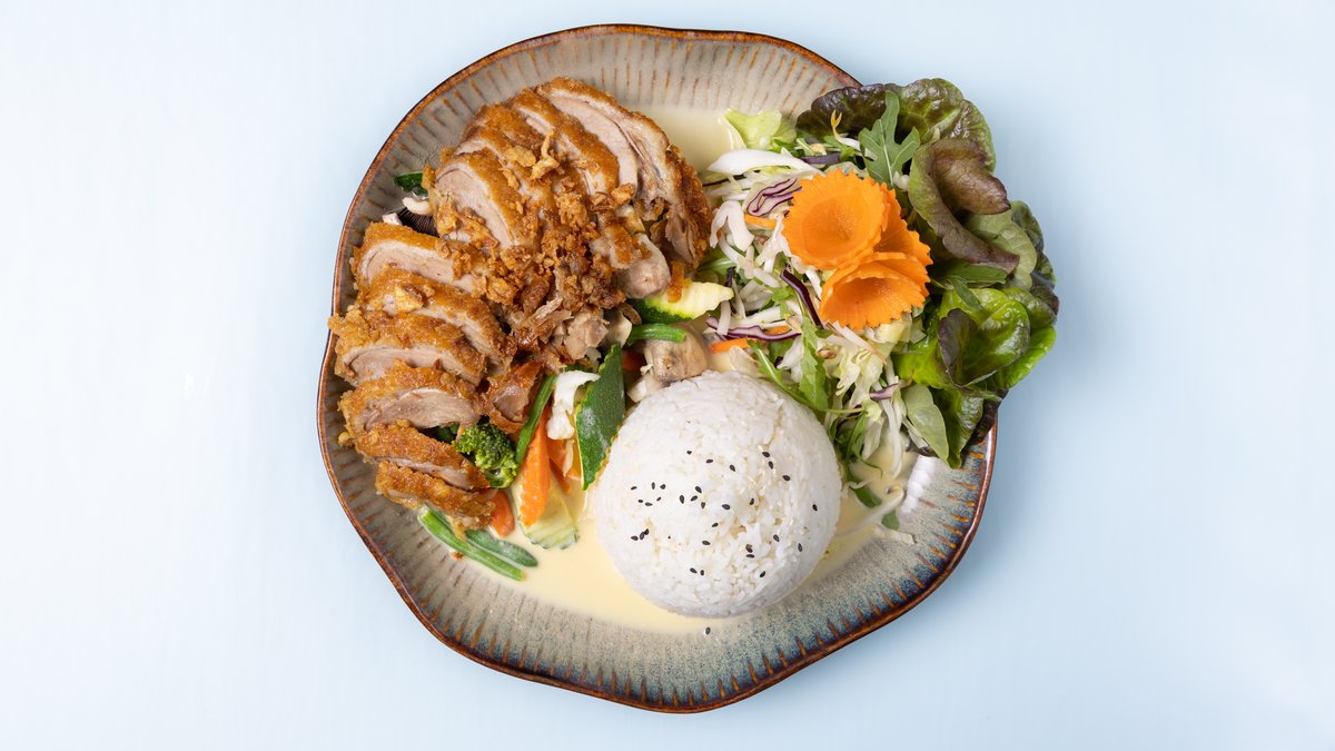 cremige Kokos-Currysoße auf vietnamesischen Reisbandnudeln, Wildkräutersalat, Sojasprossen, gerösteten Erdnüssen und Sesam