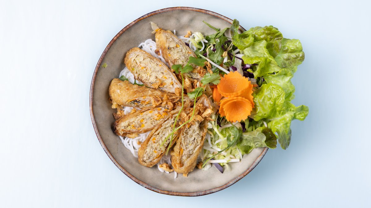 2 Stück Reispapiermantel gefüllte mit Reisnudeln, Salat, Kräuter und Limetten-Fisch-Dressing
