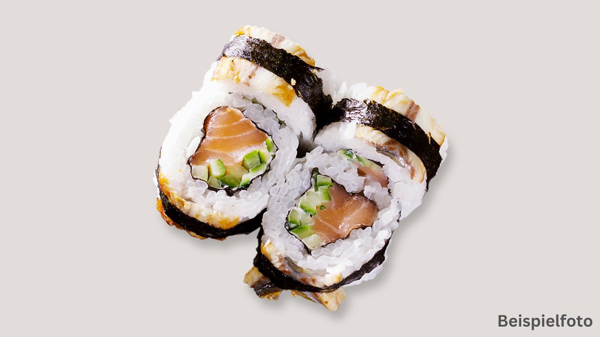 mit gegrilltem Aal, Gurken, Unagisoße, Mayonnaise und Sesam