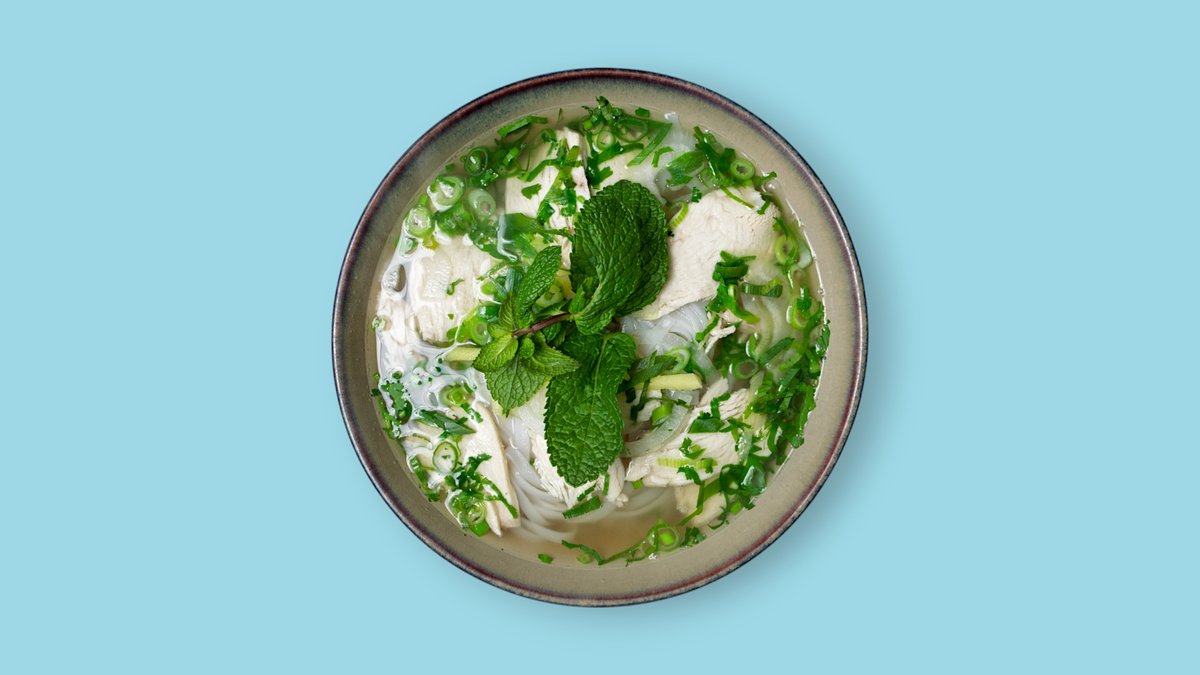 mit Sojasprossen, Pak-Choi, Karotten, Sellerie, Morscheln, Ei, Koriander und gerösteten Zwiebeln