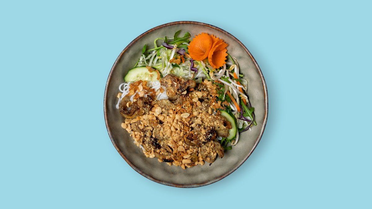 mit mariniert gegrilltem Schweinefleisch, Reisnudeln, Salat, Erdnüssen und Kräutern