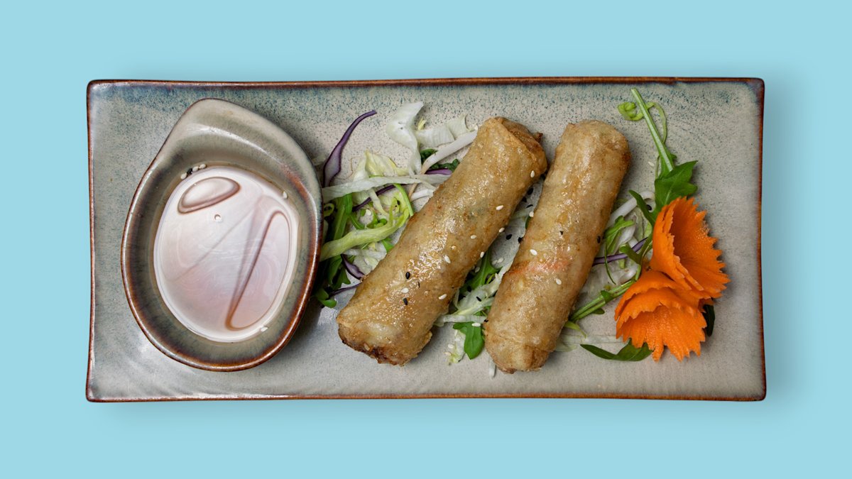 2 Stück frittierte Frühlingsrollen gefüllt mit gehacktem Schweinefleisch, Glasnudeln, Morcheln, Karotten und Limetten-Fisch-Dressing
