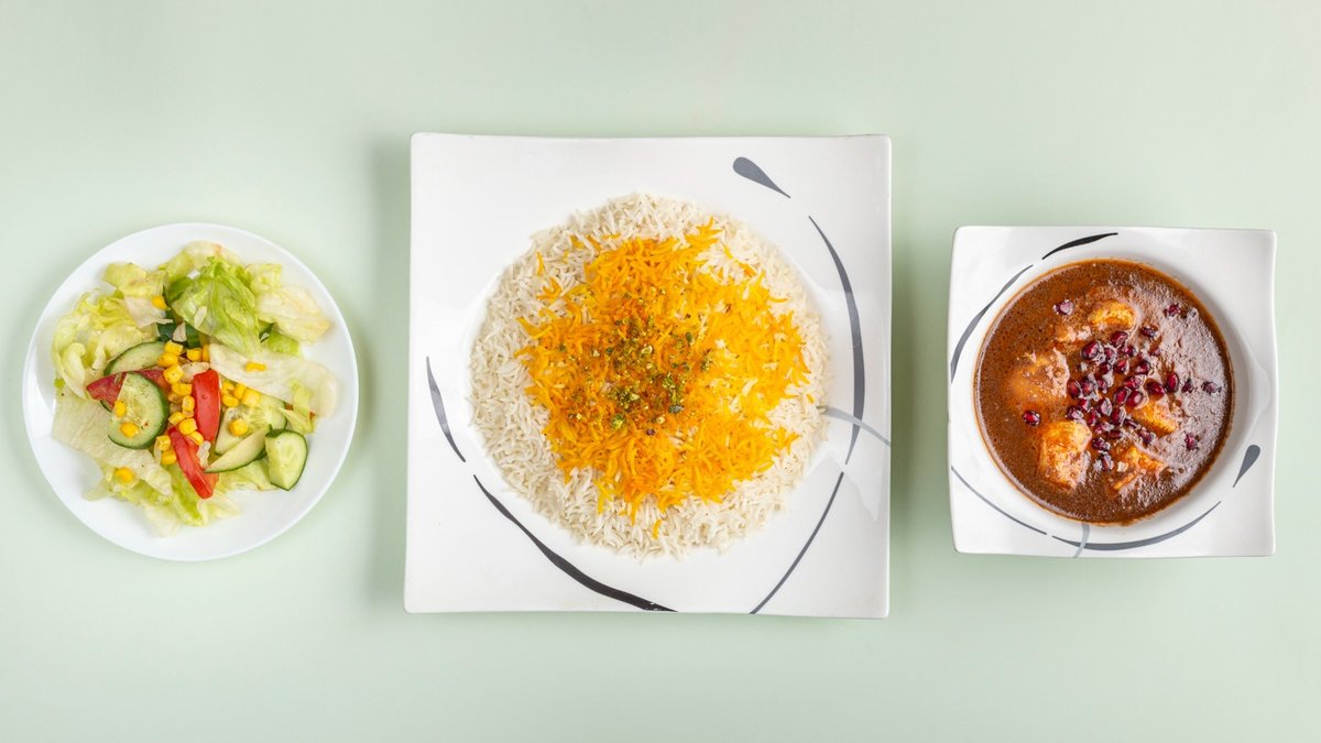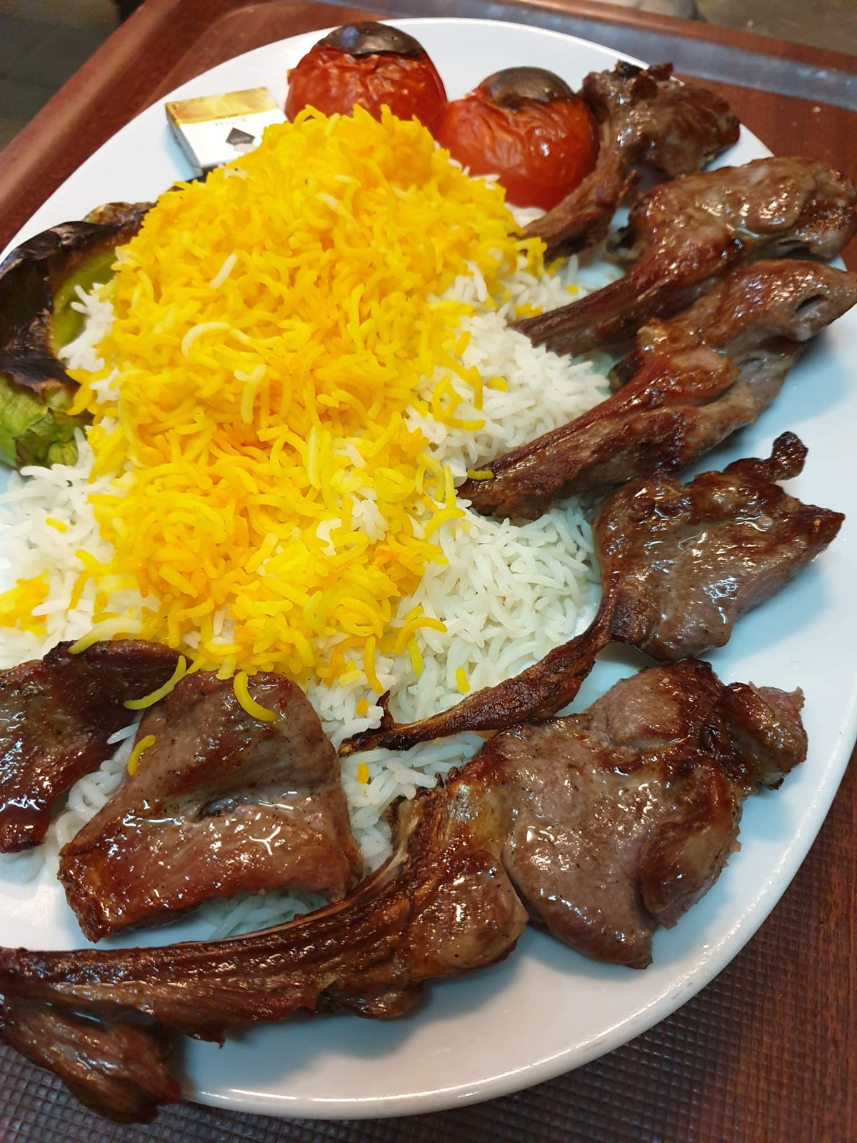 gekochtes Kalbfleisch eingelegt in Tomatensoße mit speziellen Gewürzen, gebratenen Kartoffelstreifen, halbierten Kleinerbsen aus dem Iran, gebratenen Auberginen und gegrillten Tomaten, dazu Reis mit Safran und gestifteten Pistazien