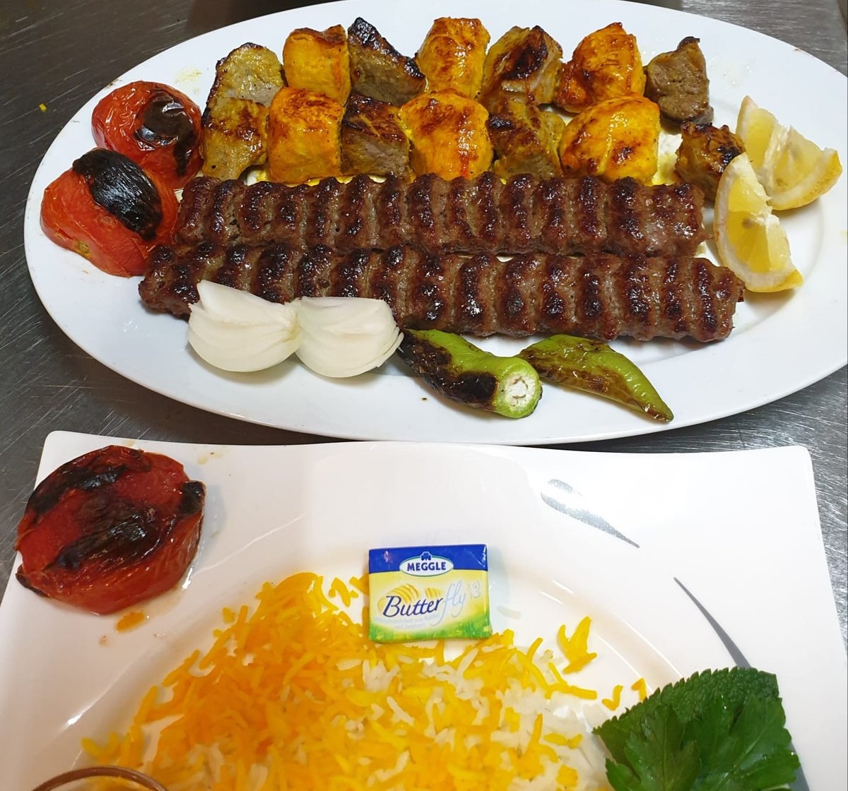 3 Kubideh, 1 Barg, 1 Chendje und 1 Bakhtiari.wird mit gegrillten Tomaten. gegrillten Peperoni. Safran Reis . salat als Beilage