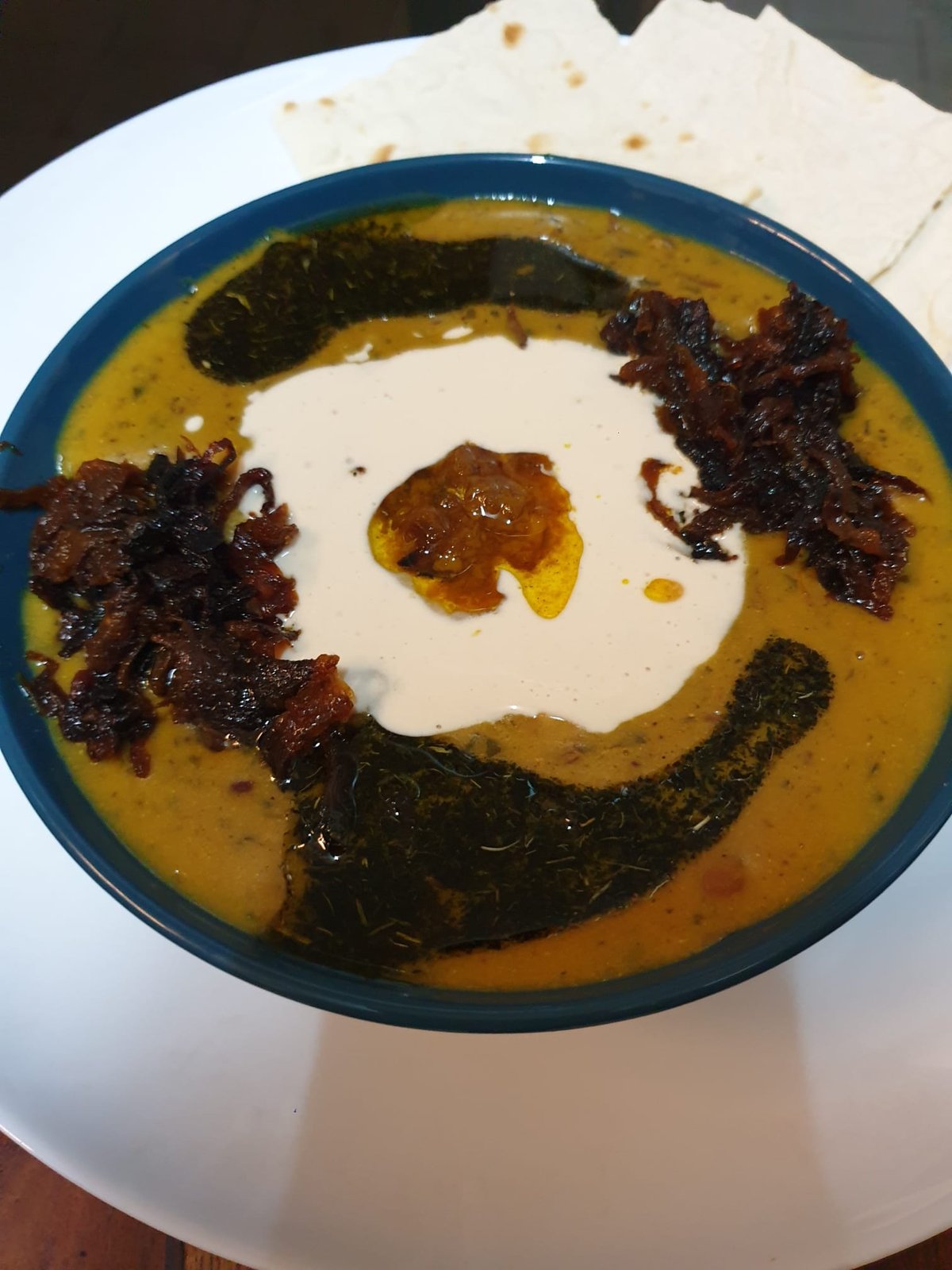 mit Nudeln Erbsen, Bohnen, Linsen, Weißmehl, Quark aus Iran, Zwiebeln, Minze und Gemüse