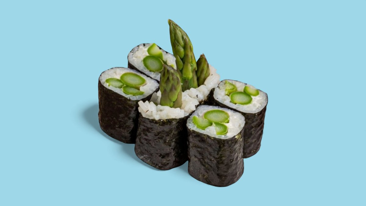 Sake nigiri with chopped salmon, asparagus, leek and mayonnaise