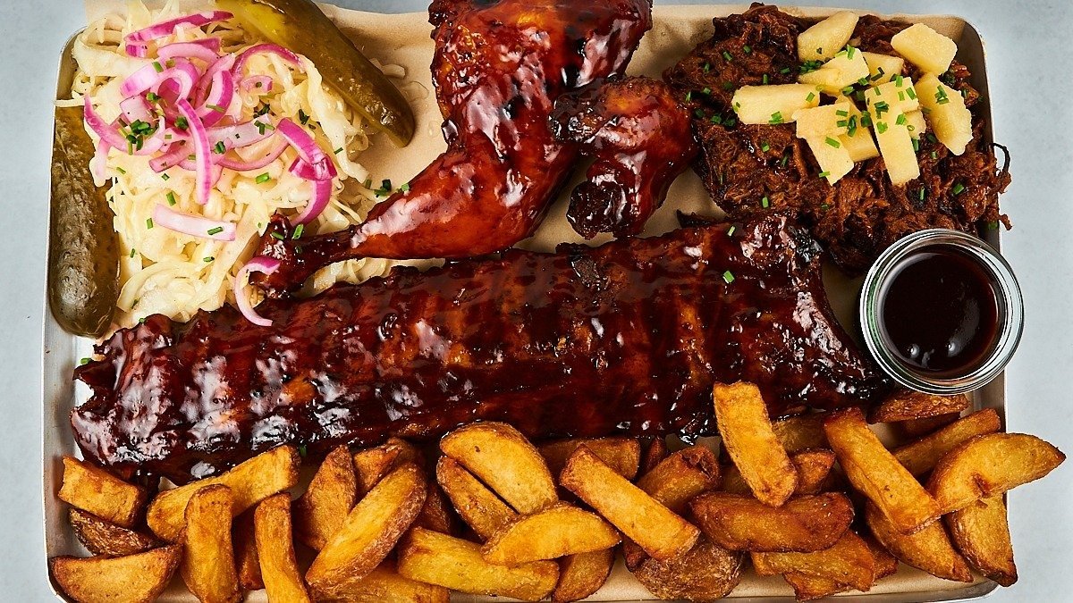 mit großen Spareribs, Hähnchenschenkel, Pulled Pork, Farmer Fries, Krautsalat, hausgemachter Barbecuesauce und Essiggurken