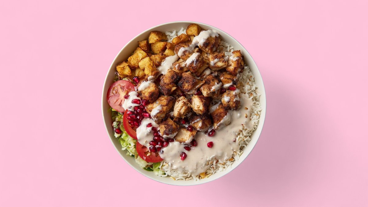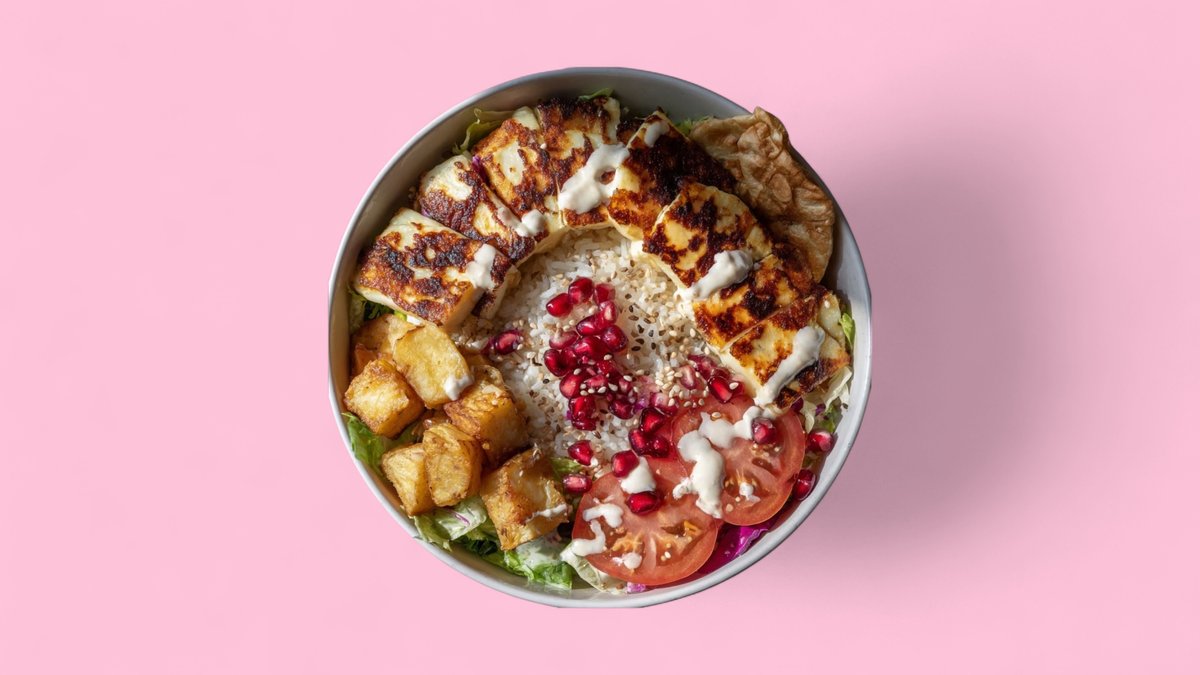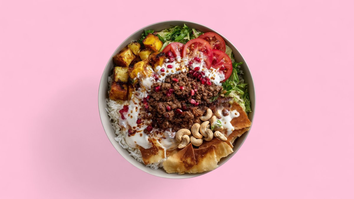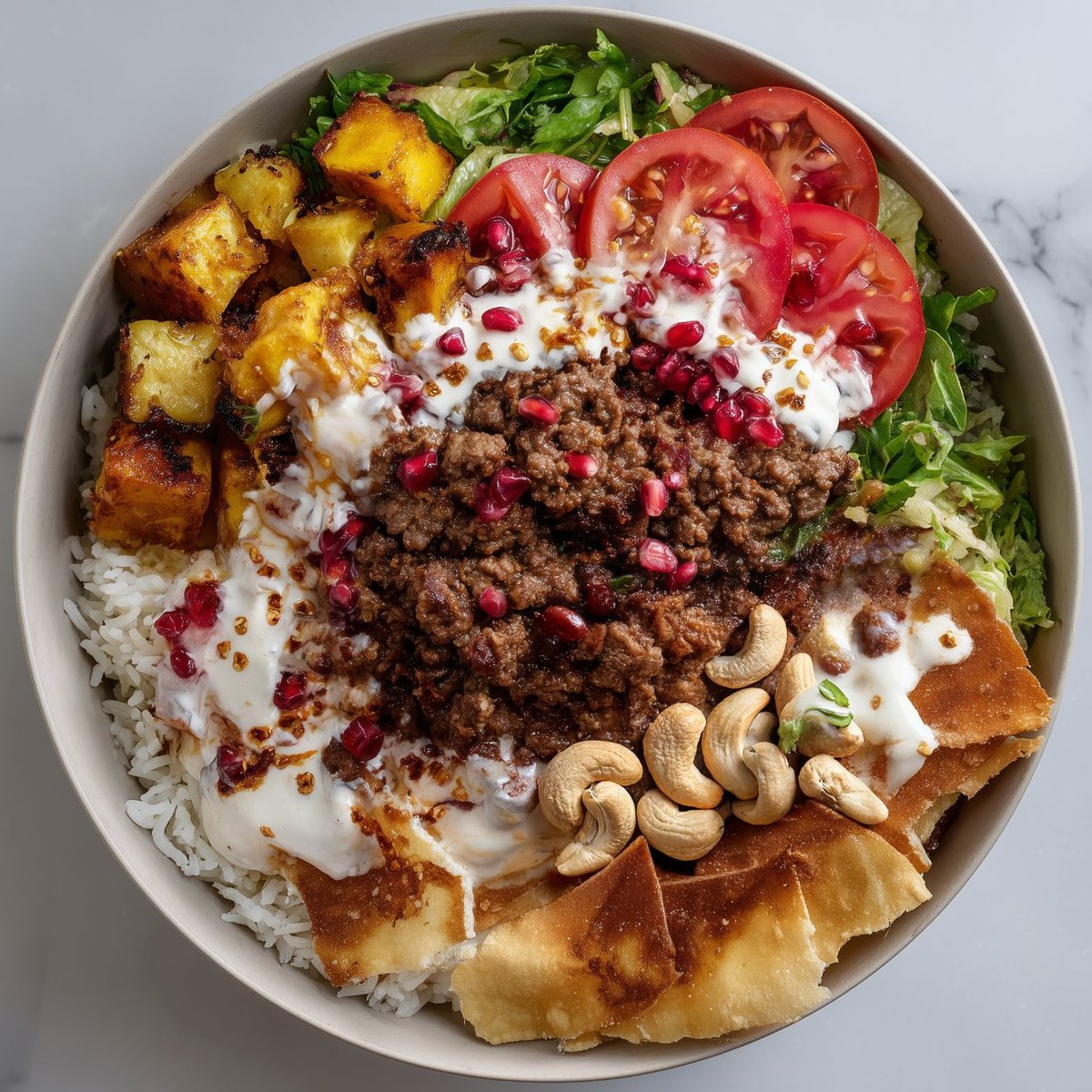 alle Bowls werden mit Basmatireis, Römersalat, Tomaten, eingelegten Gurken, Rettich, Batata Haara, Granatapfelsoße, Cashewnüssen und geröstetem Brot zubereitet