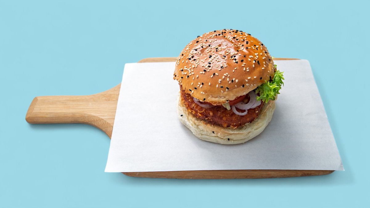 150 g Patty, Mayo, Hähnchenbrustfilet, Lollo Rosso, Röstzwiebeln, rote Zwiebeln, Tomaten und Gewürzgurken