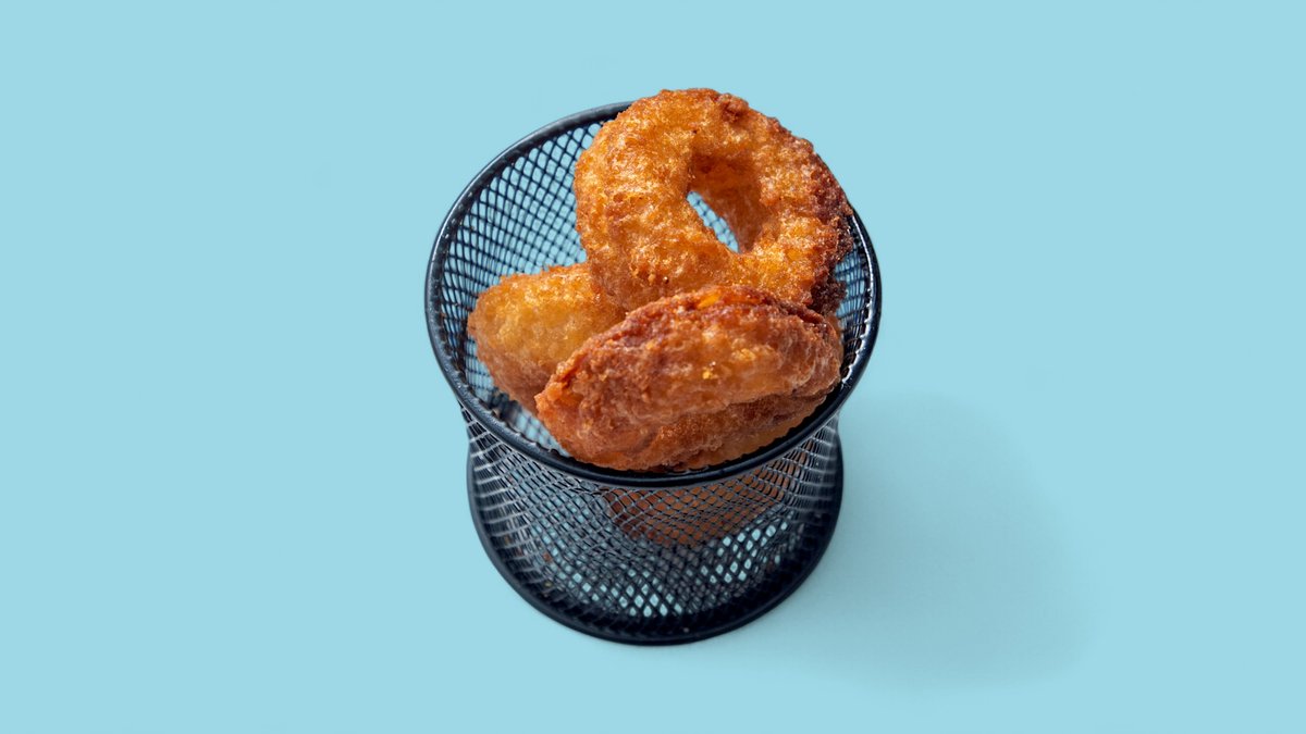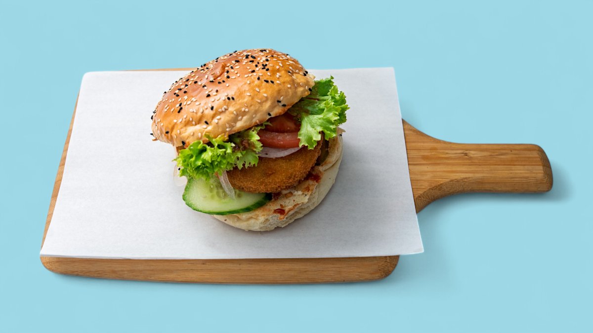 Nuggets, Mayo, Lollo Rosso, Röstzwiebeln, Salatgurken, Tomaten und rote Zwiebeln