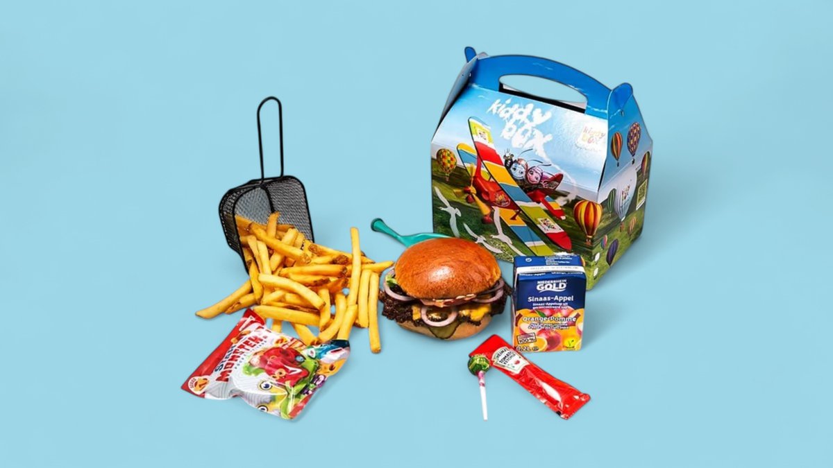 mit einem Kinder Burger, Luftballon, Lolly und einer Überraschung