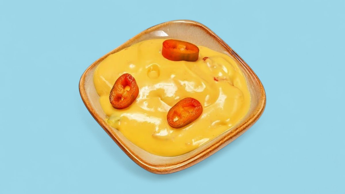 scharf mit 2 pikanten, knusprigen Hähnchenfilets, Cheddar-Soße, Jalapeños, Rucola und Krautsalat