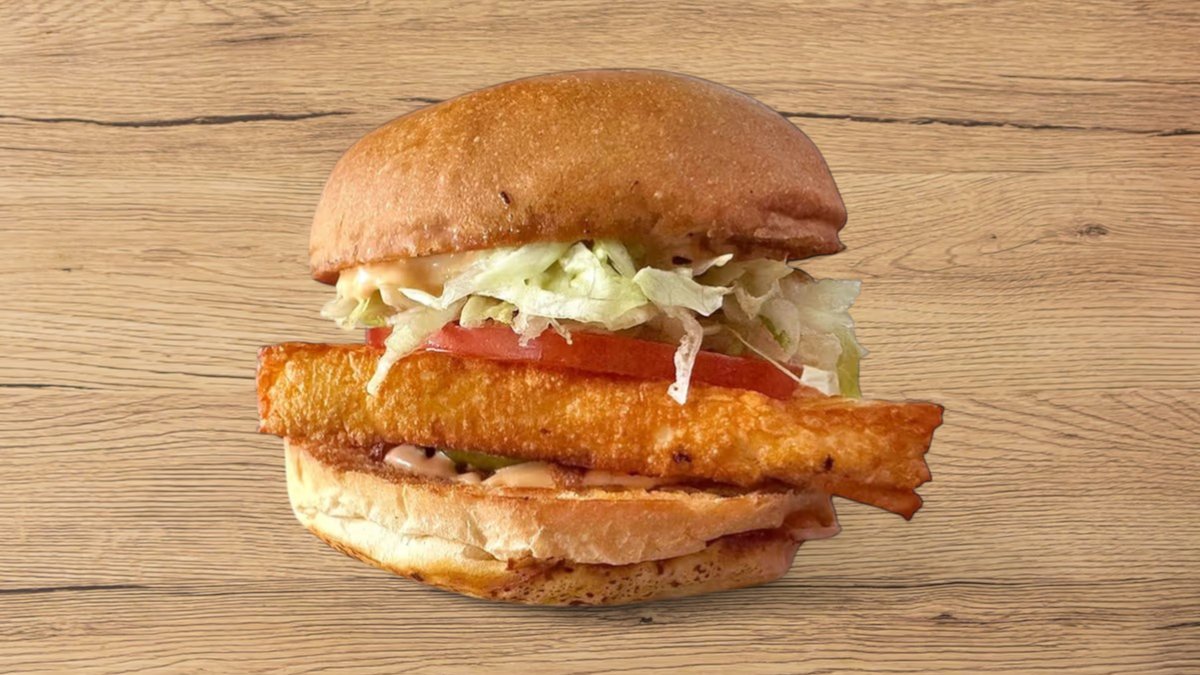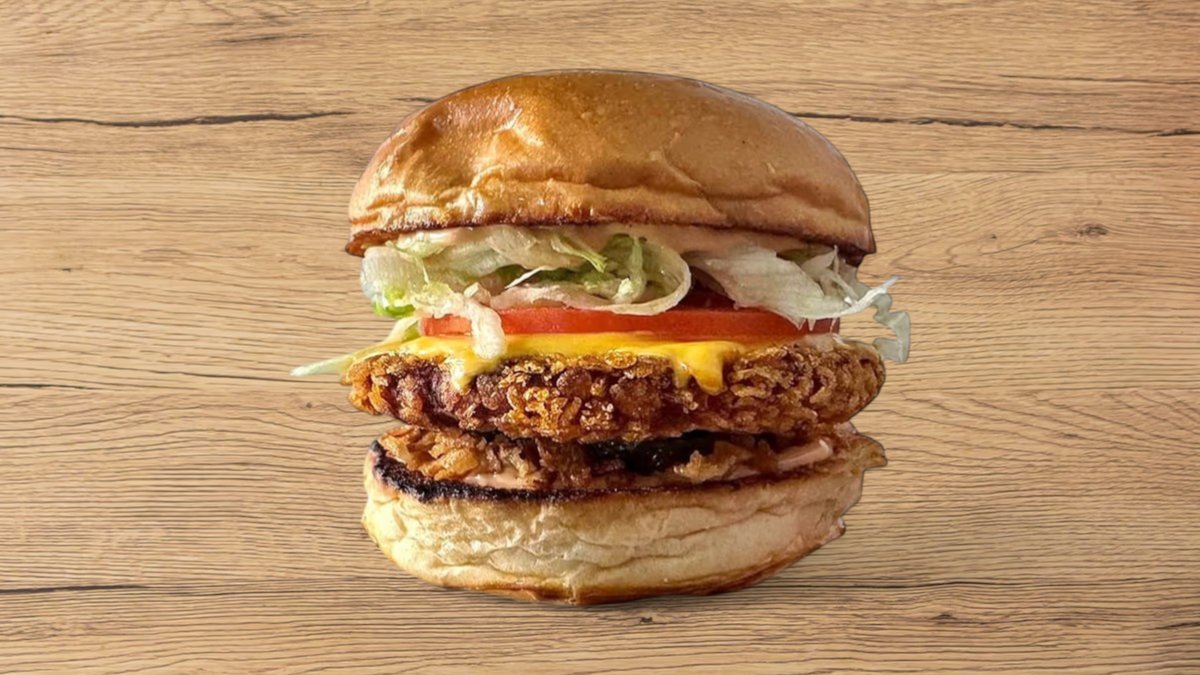 mit ca.140 g paniertem Hähnchenpatty, doppeltem Cheddar, cremiger Haussoße, Briochebrötchen, Fleischtomaten, eingelegten Gurken, weißen Zwiebeln, Eisbergsalat und Röstzwiebeln