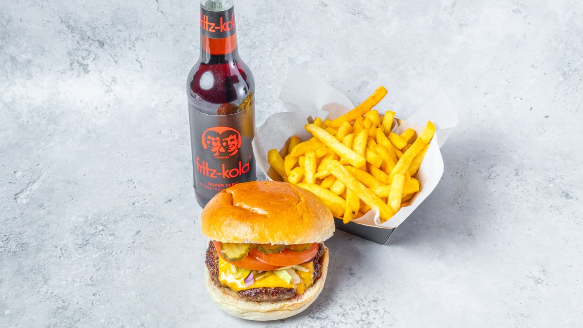 mit 150 g Rindfleischpatty, Burgersoße, Snackdressing, Käse, gegrillten Zwiebeln, Eisbergsalat, Tomaten und Burgergurken