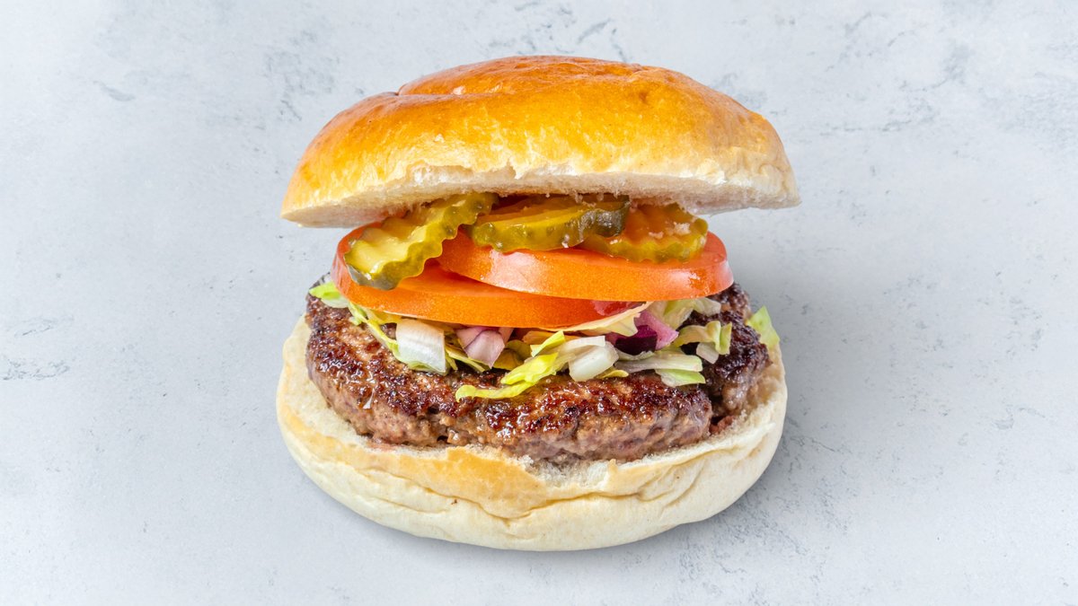 mit 150 g Rindfleischpatty, Burgersoße, Snackdressing, gegrillten Zwiebeln, Eisbergsalat, Tomaten und Burgergurken